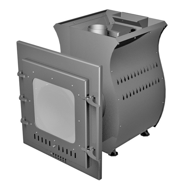 Печь имеет окраску кремнийорганической краской и от других моделей отличается самым маленьким размером и большим порталом со стеклянной дверцей 26". Данная печь хорошо подходит для парных помещений объемом от 4 до 12 кубов. Предпочтительна для небольших парных помещений в южных регионах России. В северных регионах при соблюдении хорошего утепления здания. Печь с двумя парогенераторами конвекционного типа. Дополнительная подача воздуха для дожига газов выводит печь на лучшие чистые режимы. Колпак, которым оборудована печь позволяет дожечь газы не в дымоходе, а еще в печи, из-за чего значительно снижается температура дымохода и исключается его засаживание. Стекло в двери позволяет не только наблюдать за живой игрой огня, но и достигать лучшей регулировки горения дров. За счет этого печь наиболее экономична и эффективна. Великолепная способность создания легкого пара ставит эту печь на высокий уровень по созданию банных паровых режимов.